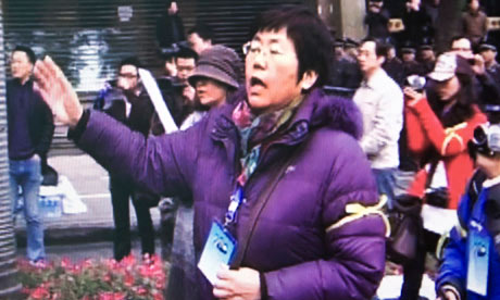 NOTA: Los tuiteros @dc_b y @Suyutong informaron sobre lo que acontecía frente a la entrada de la Corte de Justicia donde se juzgaba a Wang Lihong. Allí se concentraron numerosos activistas en apoyo de la acusada, medios de comunicación y policías. El tweet retuiteado por Ai Weiwei es sólo uno de los muchos que se editaron y se refiere a la anécdota de la pérdida de un zapato en los forcejeos con la policía. Las siguientes fotografías fueron tomadas por asistentes a la concentración.